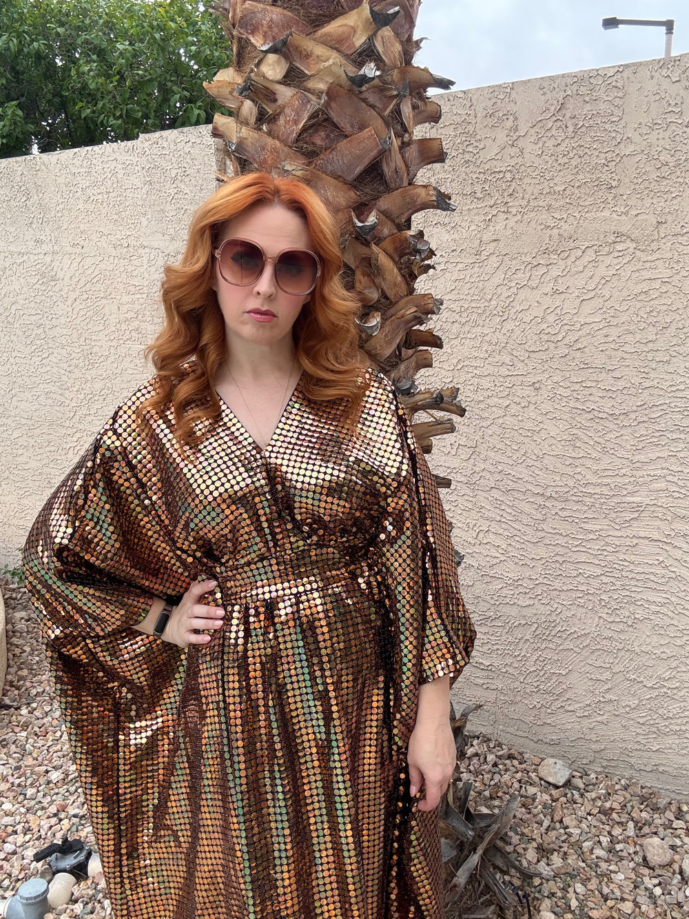 CAFTAN CARE: Iridescent disco sequins design on metallic poly spandex 2-way stretch, wash cold/delicate in a garment bag, lay flat to dry.